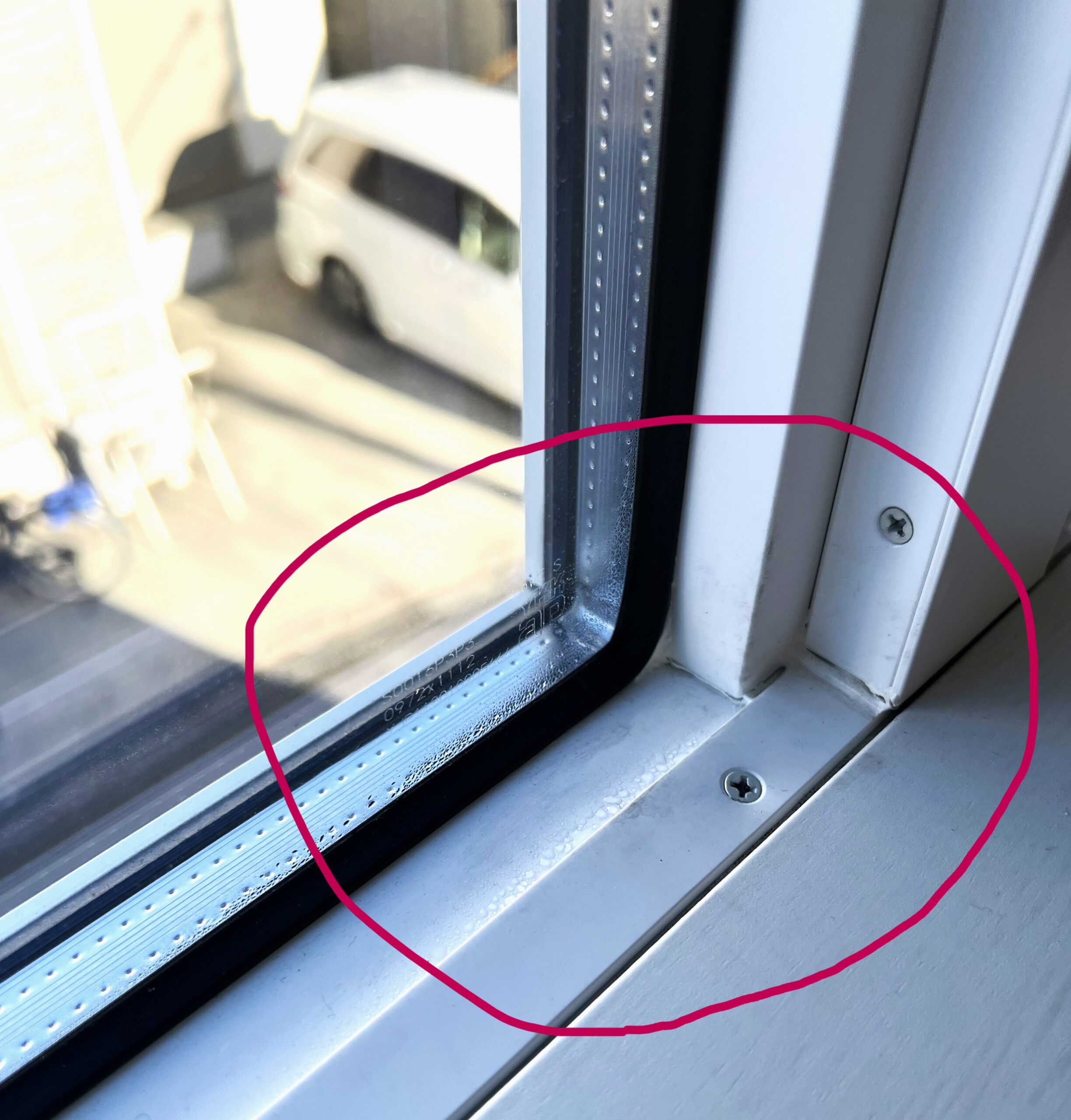 結露が出ている状態です(カビが心配ですね)内窓の効果を説明し