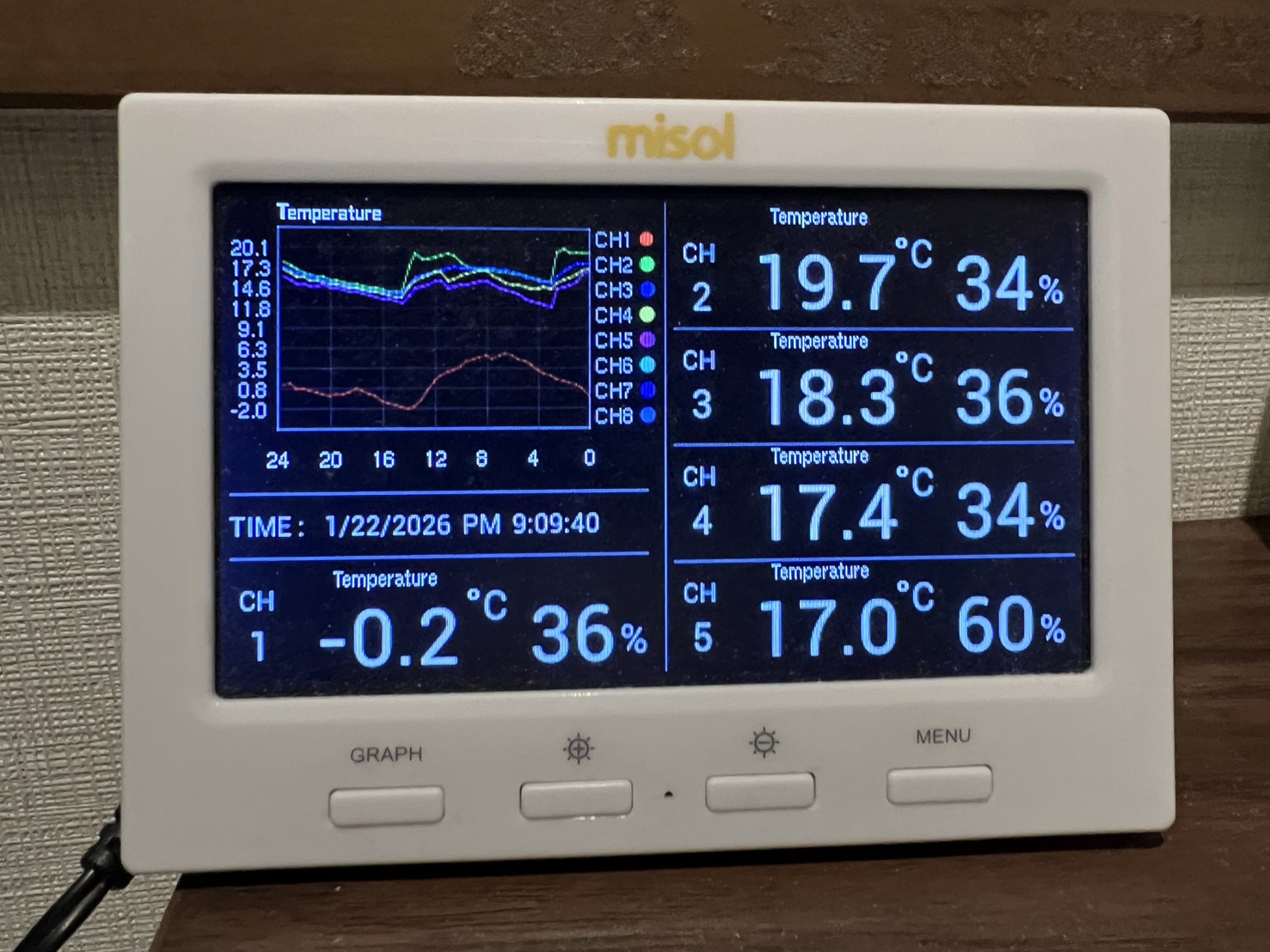 最強最長寒波の最中1/22の夜9時の外気温(CH1)はすでに氷点下-0.2でした