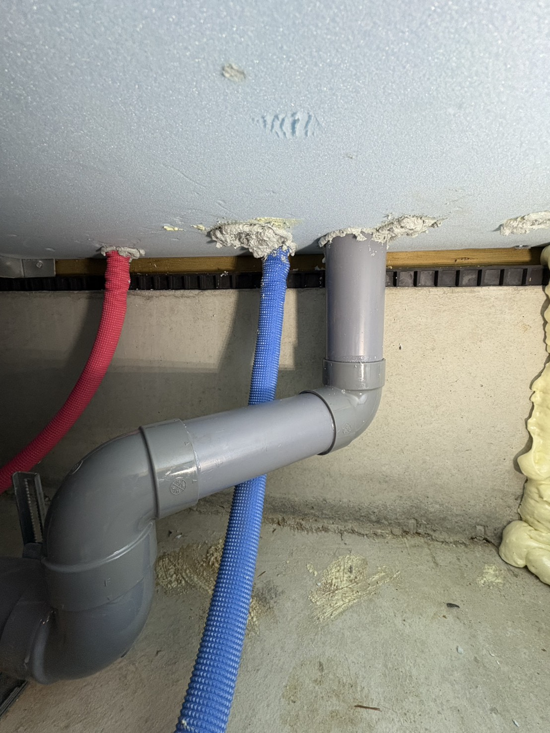 ウルトの弾性のウレタンで床下配管周り、断熱気密処理