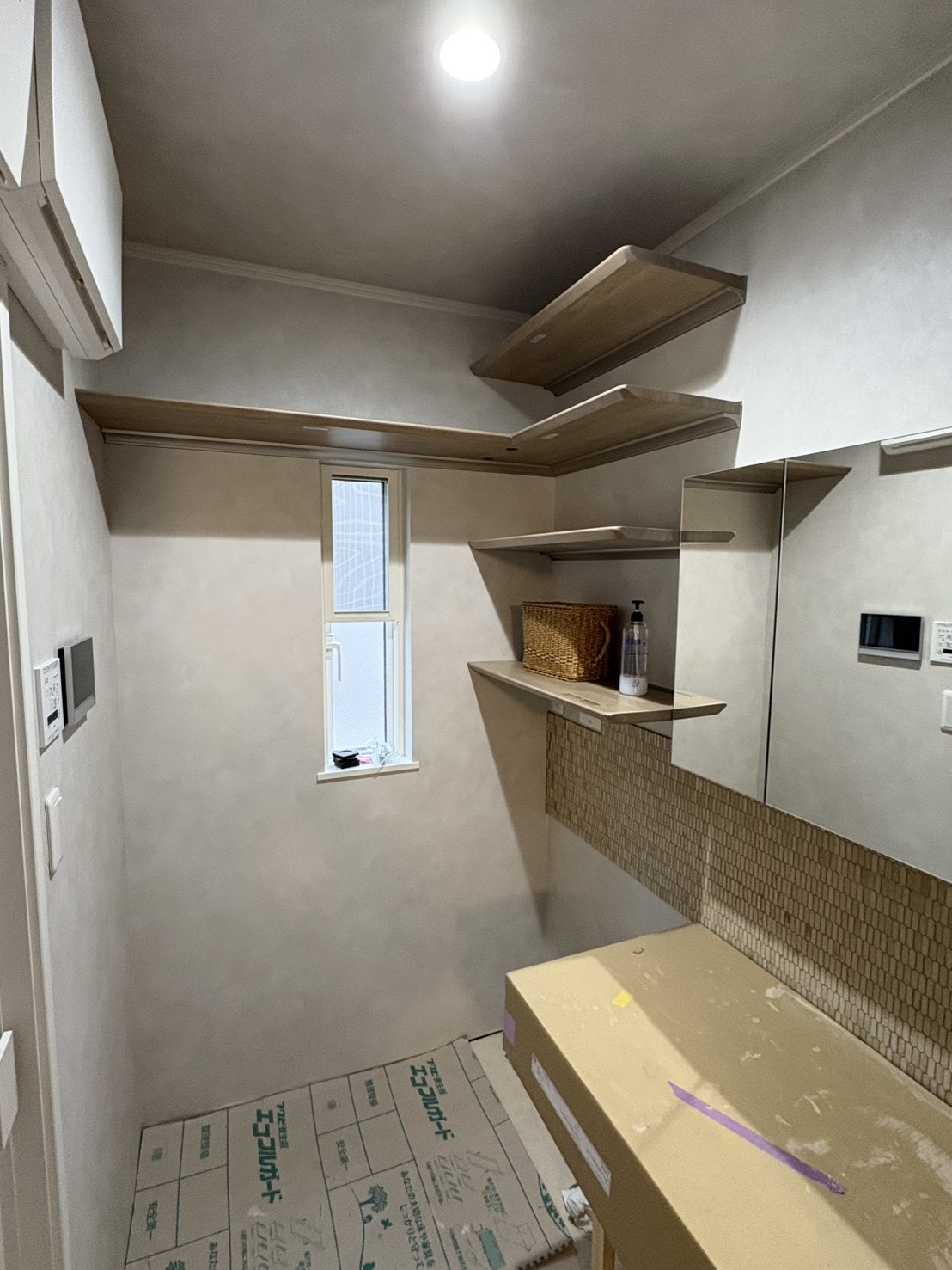 三面鏡下のカウンター部分に施工しました、選んでいただいたボウルと