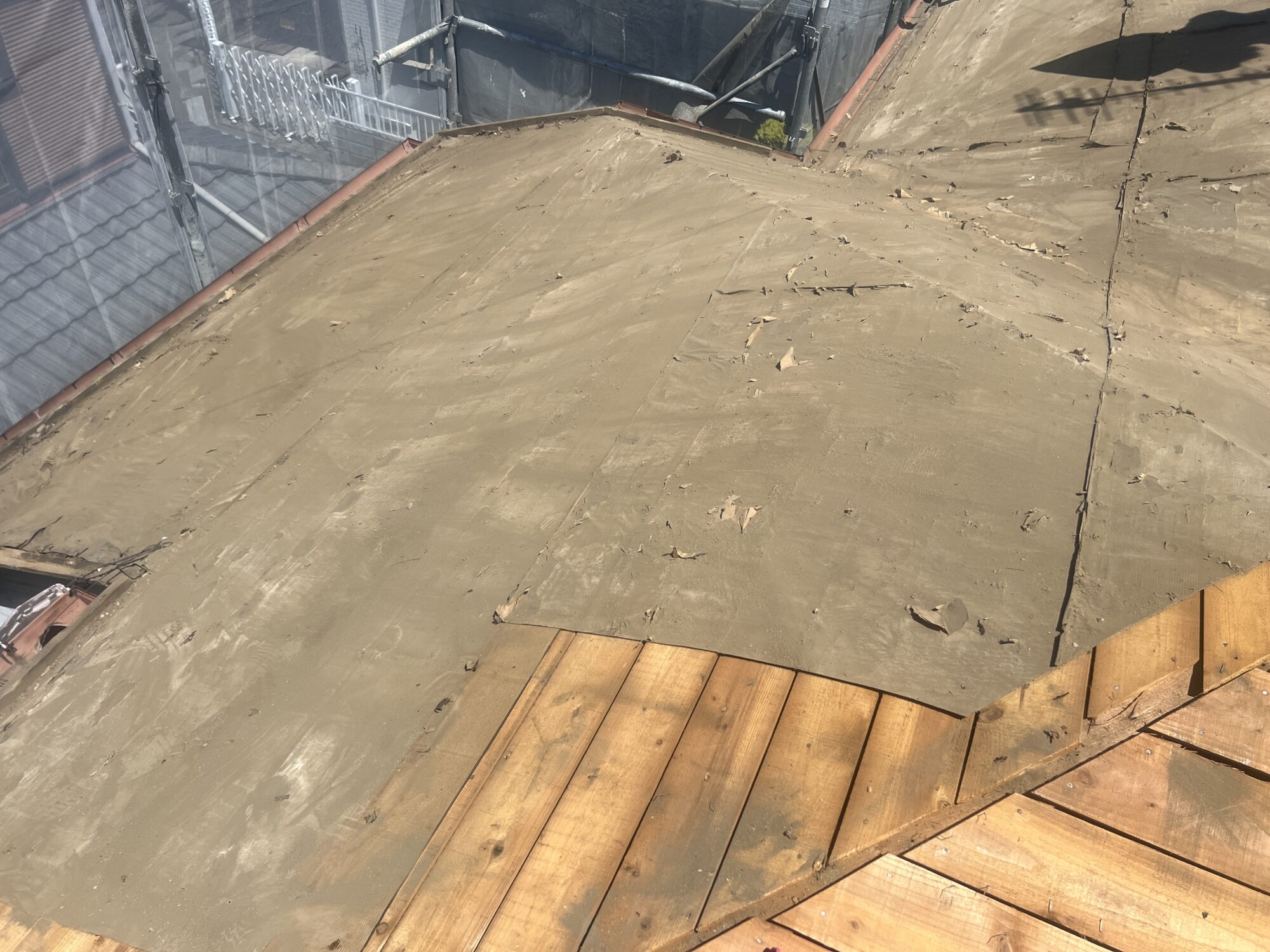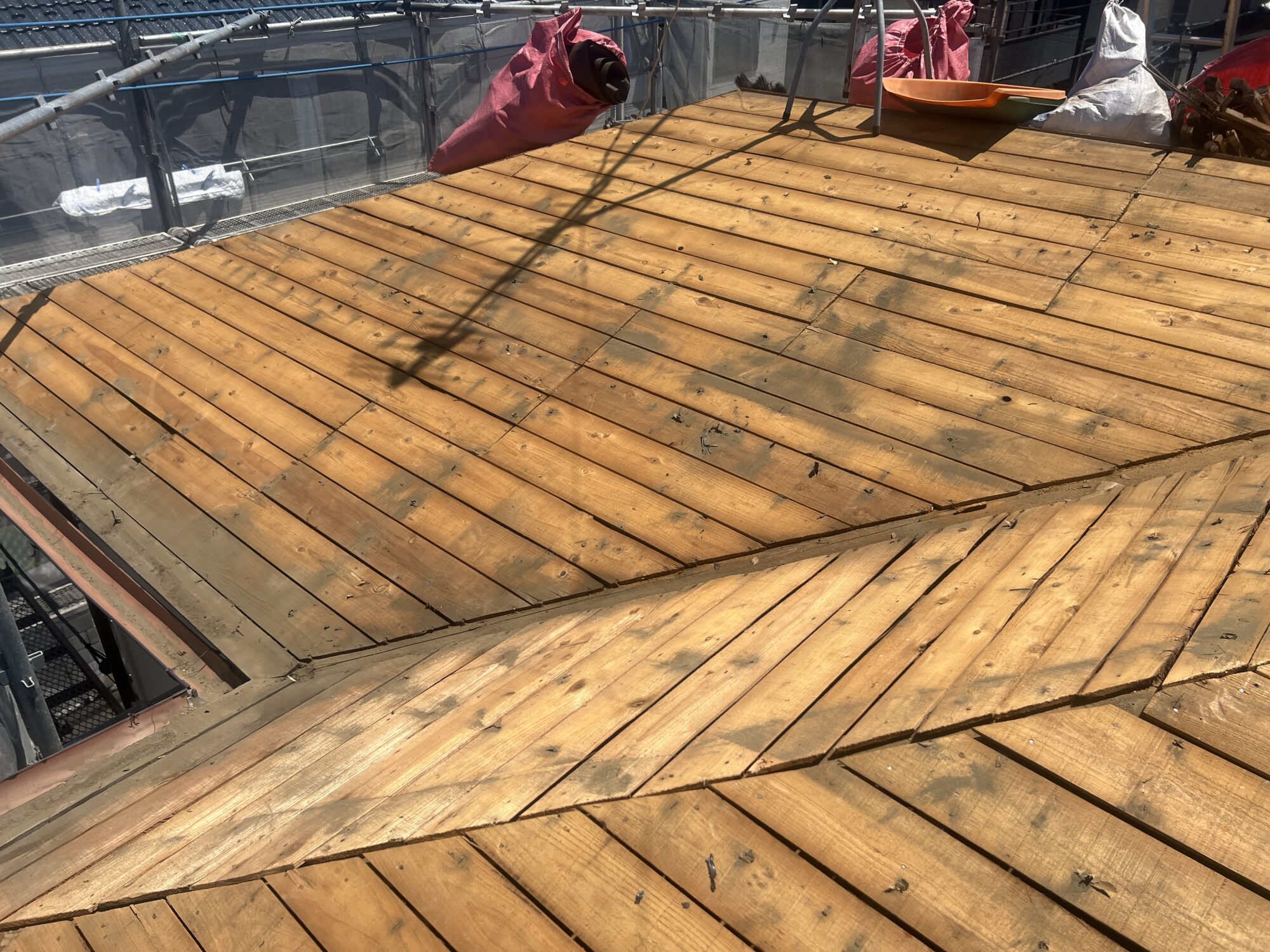 今回は傷んでいる所はなかったですが、あればこの状況で修理して、新しい下地材(野地板)を重ね張していきます。