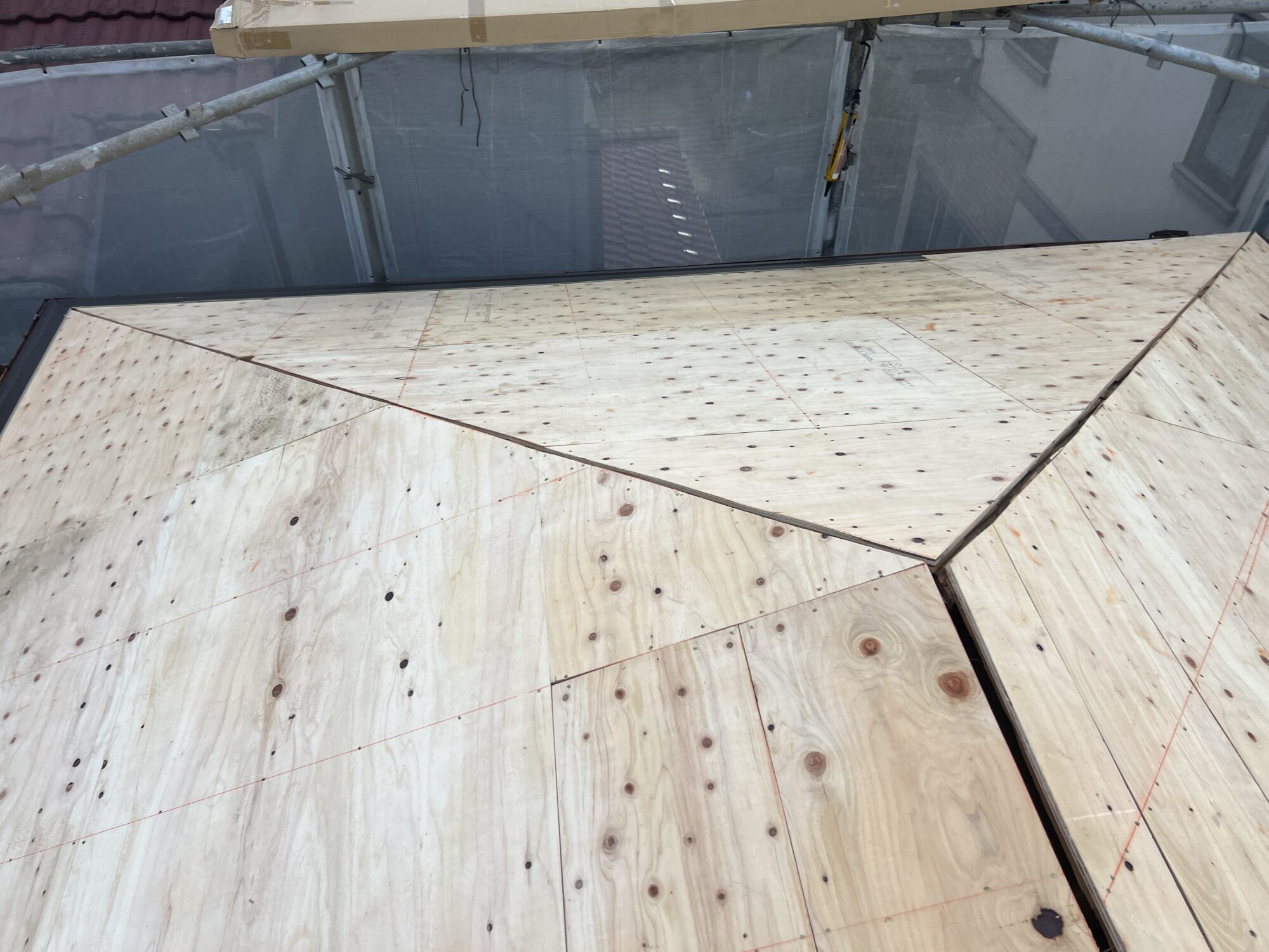 新しい構造用合板を既存の屋根下地材の上に重ね張した状態です。